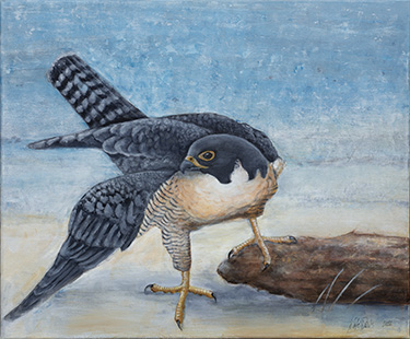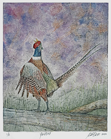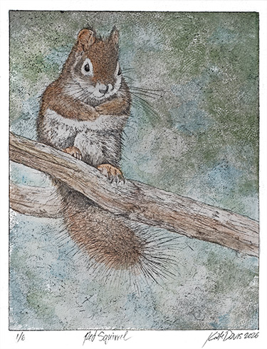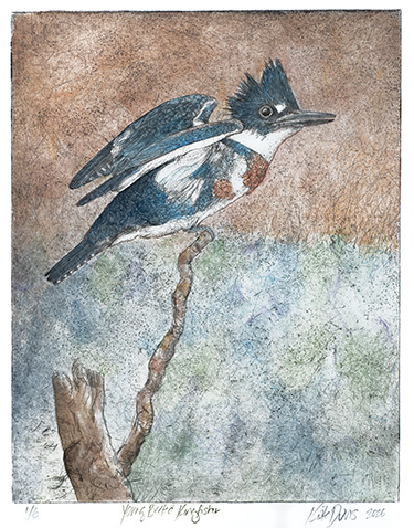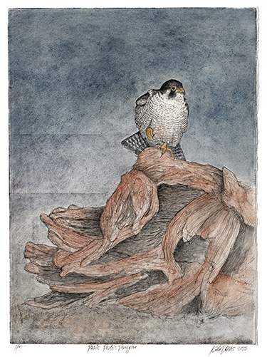 Kate Davis has been actively involved in wildlife art since 1975 when her pen and ink drawings were first published in the Cincinnati Zoo News. She is an internationally recognized wildlife artist and a national award-winning taxidermist. The source and inspiration for Kate's depictions are birds in the wild and the resident eagles, hawks, owls, and falcons of Raptors of the Rockies, both past and present. Back in 2004 Kate began welding metal bird sculptures under the tutelage of Bill Ohrmann. Sculpture frames are made with 1/4 inch rounds, then 16 gauge steel pieces are cut with a plasma cutter, shaped by pounding with a hammer, and attached with a wire-feed welder. The garage has been transformed into a welding studio and resident birds have been great models. In 1989, Kate began creating zinc plate etchings in an independent printmaking class with Don Bunse at the U of M. The metal plate is coated with a ground, image drawn in with a needle and aquatint values added with spray paints. It is etched in a bath of nitric acid, plate washed with solvents, repeat. The print "MEFE" had 12 trips in the acid! After a nearly 20-year hiatus, Kate is back at the printmaking projects, drypoint etchings at home now. Images are drawn on a special plastic (PETG) with a utility knife, background inks rolled on with a brayer, run through the press. Then the real fun - painting with gouache. Inks are water-based and can be washed in the sink, way easier, and safer. She is now exploring the world of Claybord - painting and etching combined.
